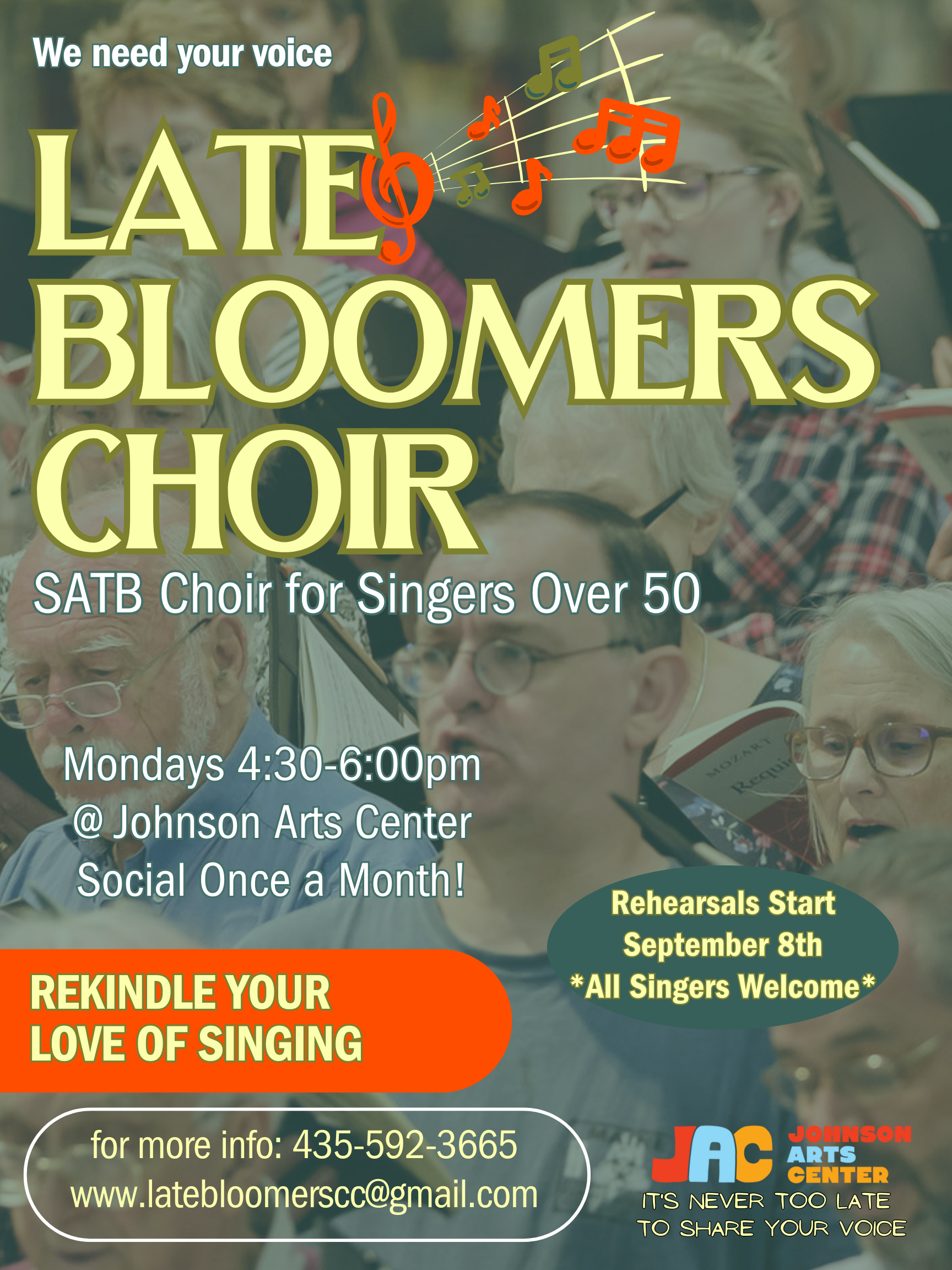A mixed (SATB) choir for senior singers. That’s right—a group for just us over 50 kids! We are sponsored by the Johnson Center and meet Mondays at from 4:30-6